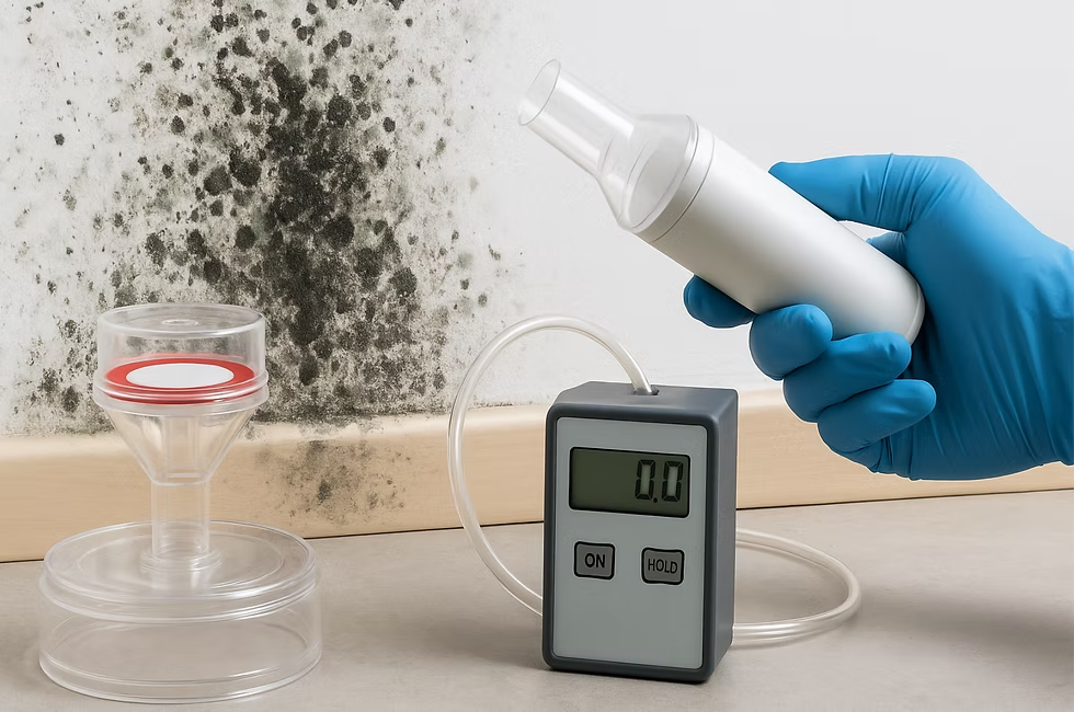 • Surface Samples: Swabs or tape lifts are used to identify mold on walls, floors, and HVAC components.