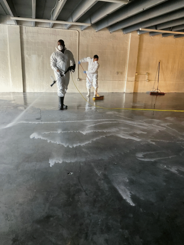 - HEPA filtration vacuums and air scrubbers remove airborne particles